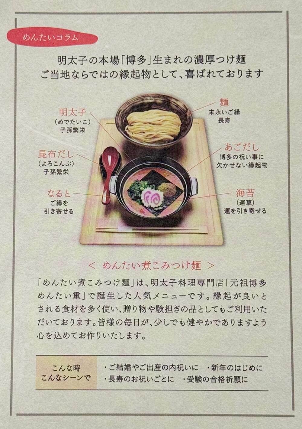 めんたい煮こみつけ麺は、縁起が良いとされている食材を多く使っているので、結婚・出産の内祝いや長寿のお祝いごと、合格祈願などのゲン担ぎの品としても利用されているそうですよ。
