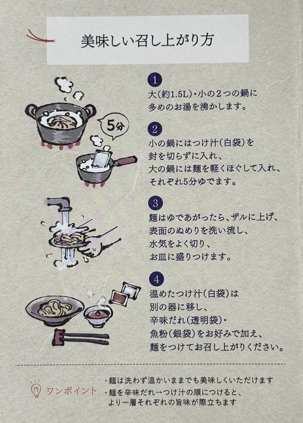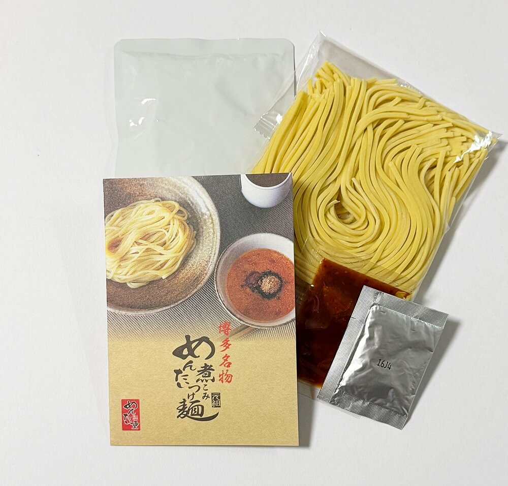 袋の中には、生麺・つけ汁・辛味だれ・魚粉とレシピがセットになって入っています。