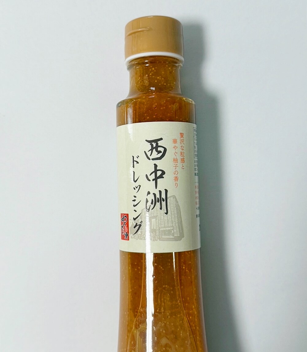西中州ドレッシングは、柑橘系の爽やかな香りとすっきりとした味わいが特徴で、明太子のプチプチとした食感がアクセントになっています。