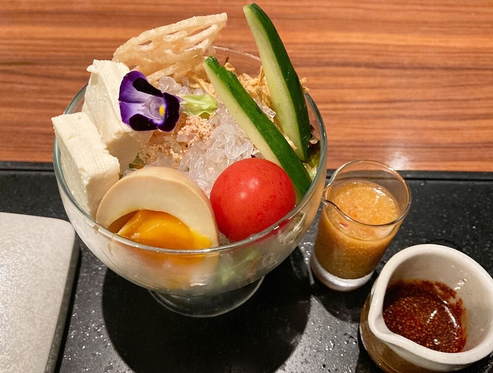 仕上げに『焼明太子』がちりばめられたサラダは、明太子料理専門店ならではの柑橘系のプチプチとした食感のさっぱりとしたドレッシングをかけて頂きます。
